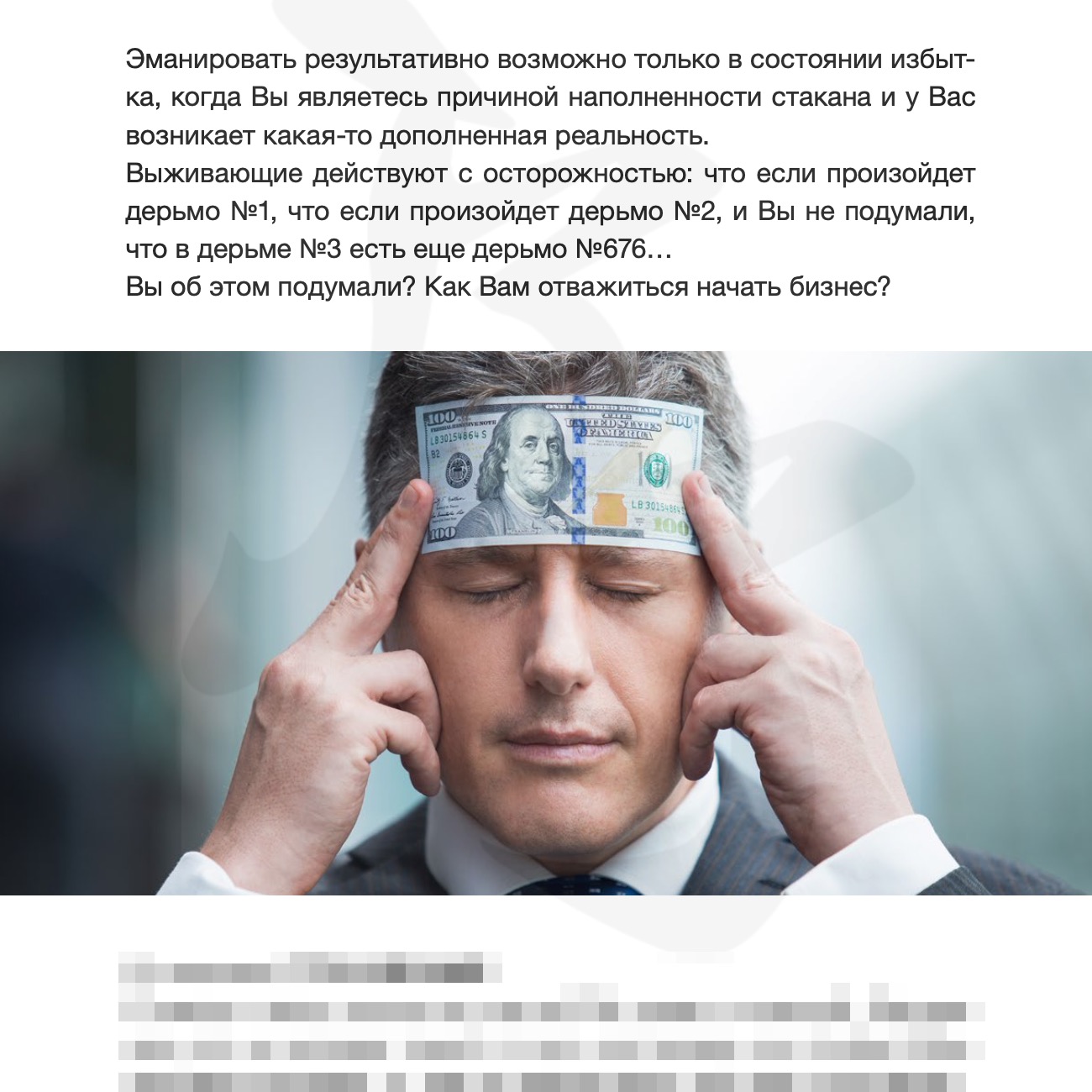 Что блокирует чудеса? Ваш собственный скепсис. Ваша уверенность, что Вы знаете, как мир устроен. Вы в чем-то убеждены и думаете, что Ваши знания окончательно верны. Но часто то, в чем Вы убеждены – абсолютный bullshit. И этот bullshit блокирует чудо, которое могло бы произойти в Вашей жизни.стр. 22 |