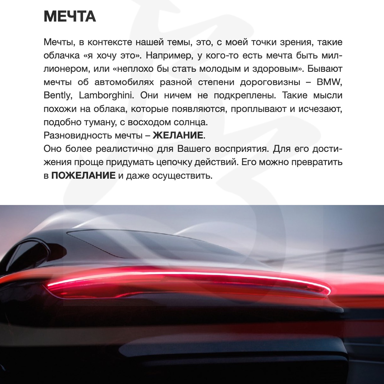 Мечты, в контексте нашей темы, это, с моей точки зрения, такие облачка «я хочу это». Например, у кого-то есть мечта быть миллионером, или «неплохо бы стать молодым и здоровым»… Разновидность мечты – ЖЕЛАНИЕ. Оно более реалистично для Вашего восприятия… Пожелания – это когда человек предметно делает заявку, направляет, скажем, стрелу с запиской или шарик гелевый с обращением, и отпускает в пространство свое «я хочу». стр. 14 |